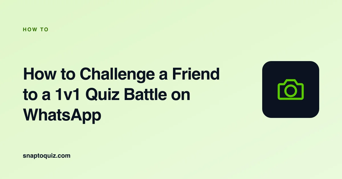 Snap a photo, generate a 5-question quiz, share the battle link on WhatsApp, and watch who actually knows what. Full 1v1 flow in under a minute.