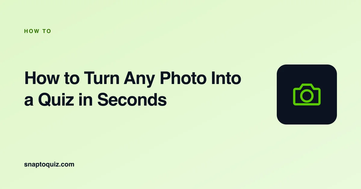Snap any photo and get a 5-question quiz with explanations in seconds. Food, landmarks, textbooks, album covers — here's how the flow works.
