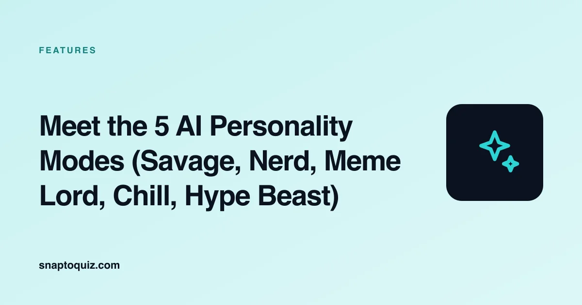 The 5 SnapToQuiz AI personality modes — Savage, Nerd, Meme Lord, Chill, Hype Beast — with sample reactions and when to use each.
